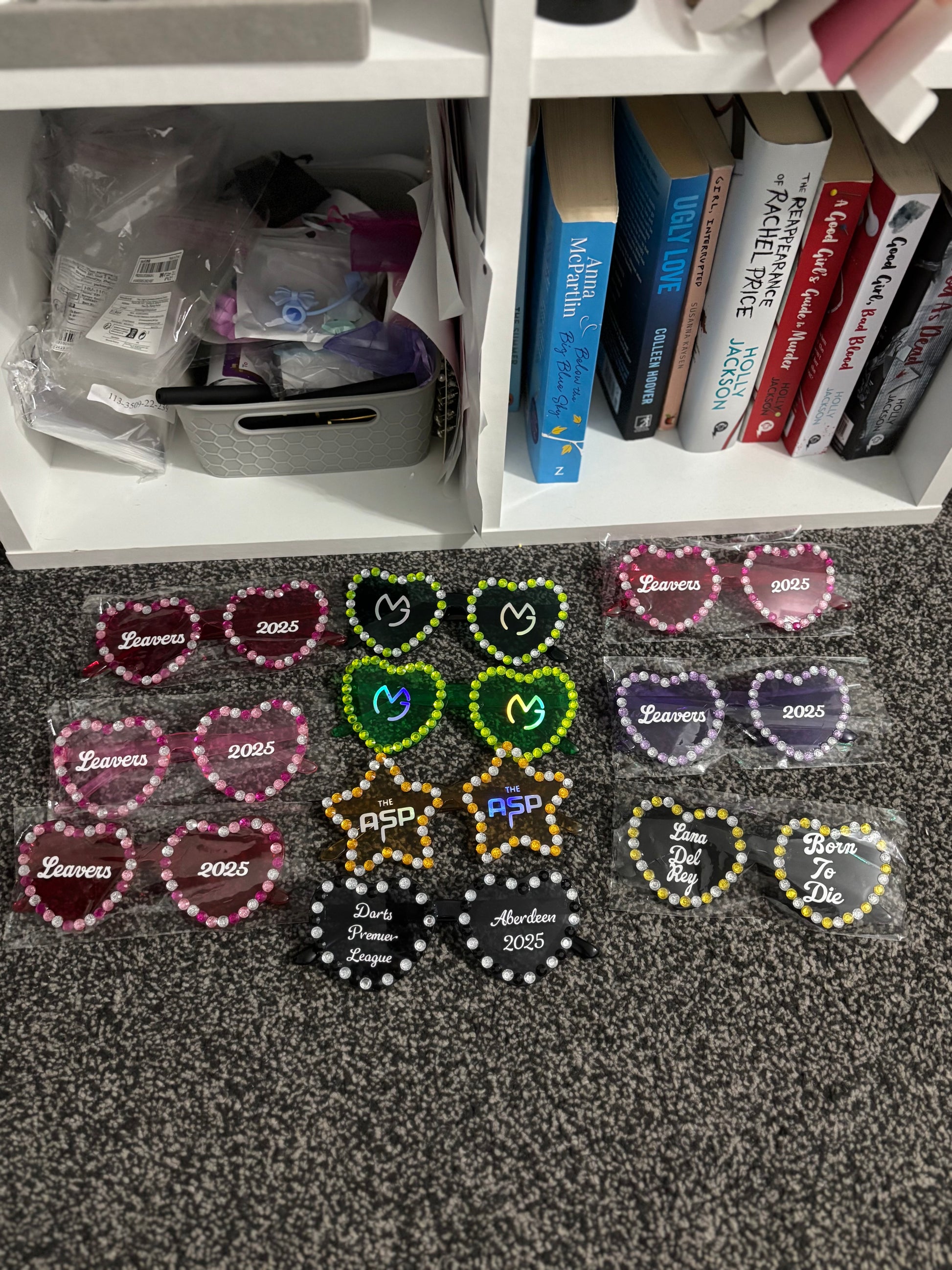 Upgrade your eyewear game with our personalized sunglasses! Choose your own color for the glasses, gems and text to make them truly unique. Don't forget to specify your desired text and double check spelling in the order notes. Stand out from the crowd and make a statement with our customizable sunglasses.